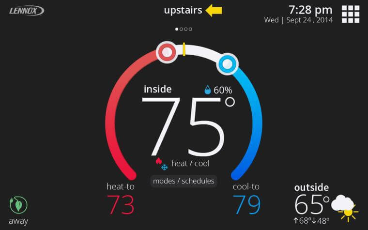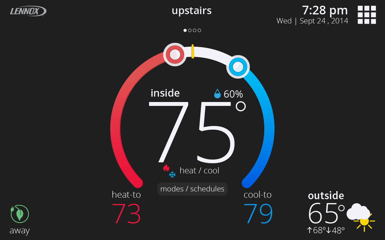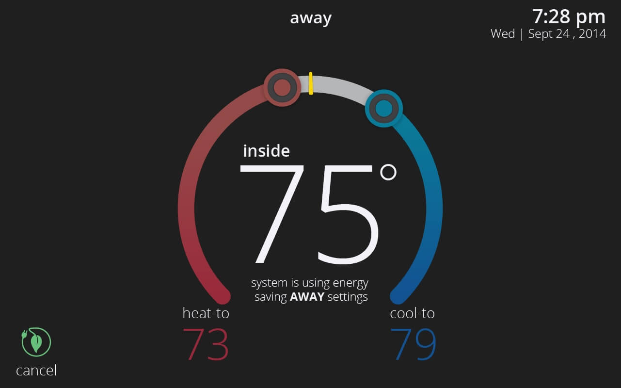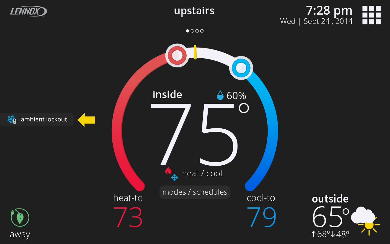 Away Mode is a special mode for when you’re away or nobody is home. When Away is active, the home screen brightness dims and it allows you to specify a heat set-point and a cool set-point that will be used when you’re not at home. You can also change the Away set-points at any time under menu > settings > away.