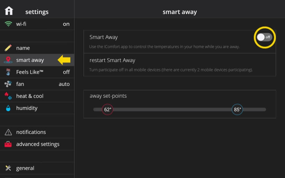 Smart Away can only be enabled if you have an iComfort® S30 account and you’re signed-in on your thermostat. -