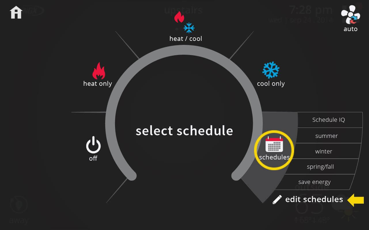 Schedule IQ is a smart schedule that works with Smart Away and combines the power of a traditional schedule. With Smart Away, you’ll never have to put your home in Away Mode when you leave or remember to adjust your thermostat temperature when returning home. With Schedule IQ, you also can set “At Home Day” and “At Home Night” set-points and times. To turn on Schedule IQ, in your thermostat’s home screen, go to modes/schedules > schedules and select Schedule IQ.